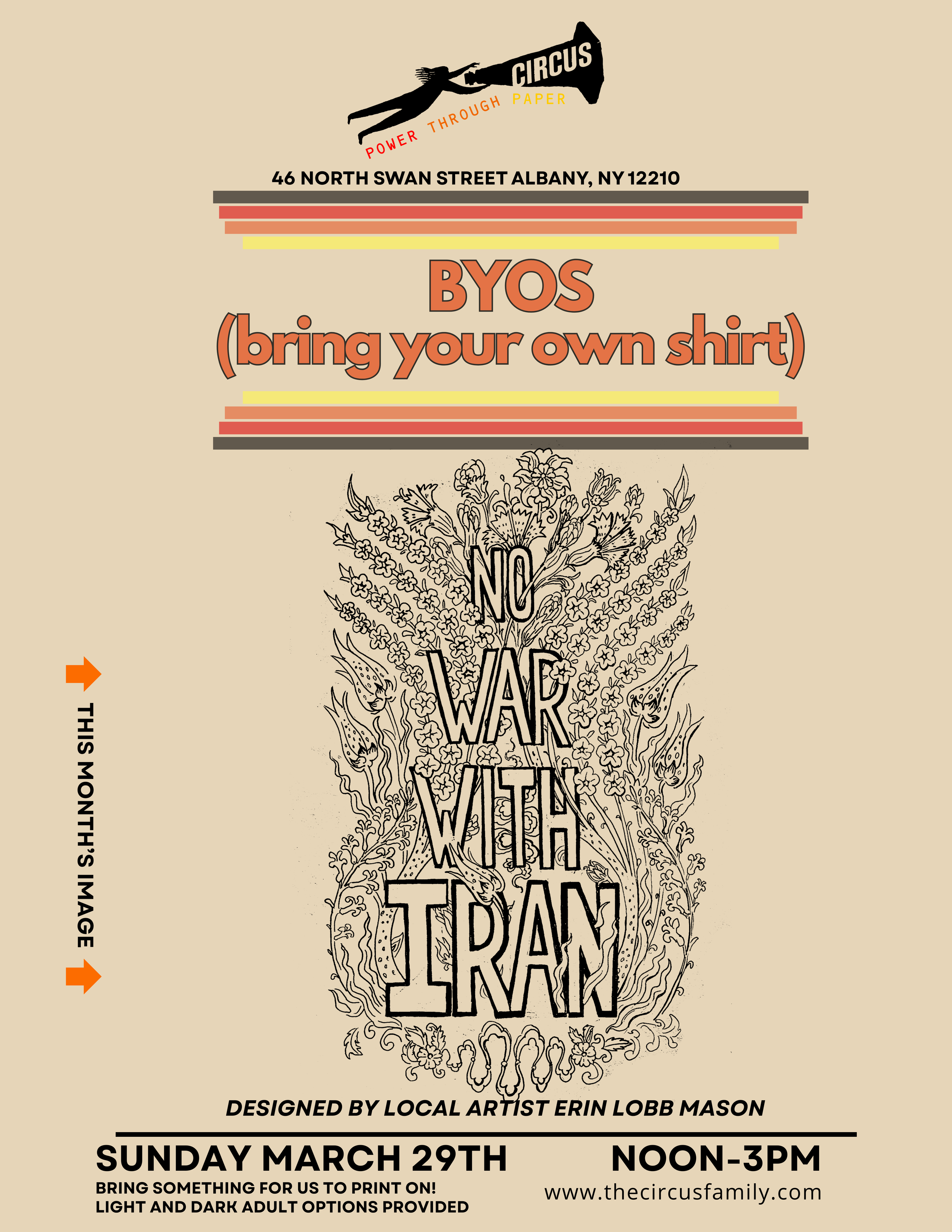 BYOS is back! Stop by and take home a shirt designed by local artist Erin Lobb Mason! Bring something for us to print on!!