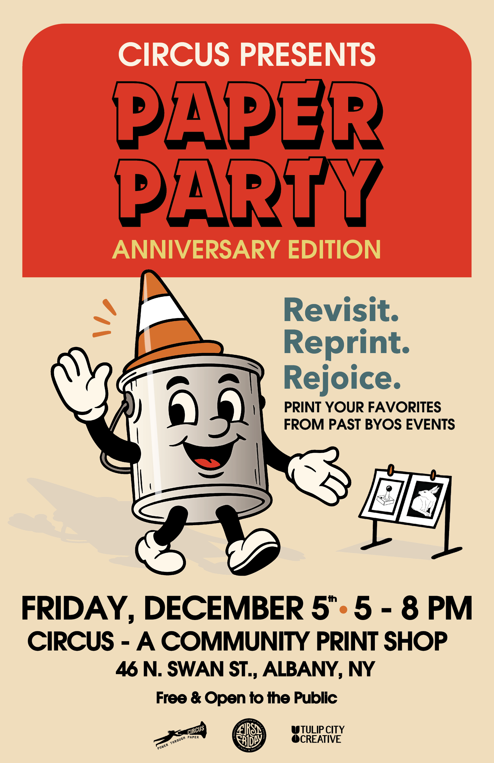 PAPER PARTY: ANNIVERSARY EDITION — December 5th! We’re opening the archives for a special First Friday celebration at Circus. All year long, you’ve seen the designs roll out at our monthly BYOS events… now you can reprint your favorites and take home the ones you missed.
